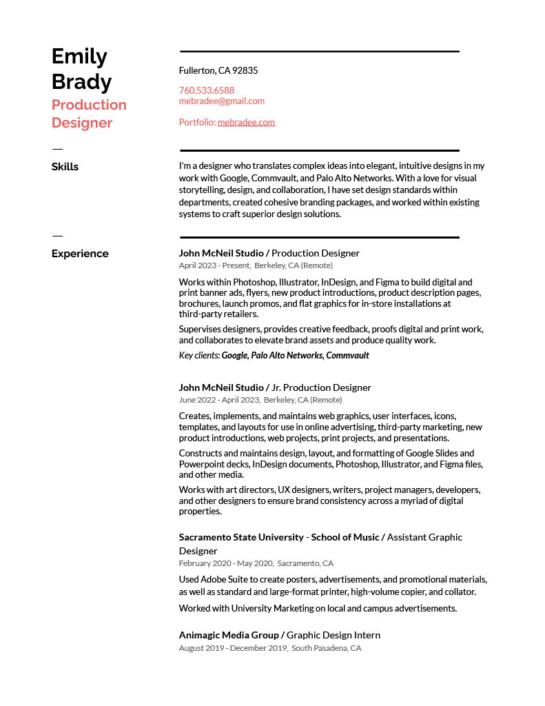 I’m a designer who translates complex ideas into elegant, intuitive designs in my work with Google, Commvault, and Palo Alto Networks. With a love for visual storytelling, design, and collaboration, I have set design standards within departments, created cohesive branding packages, and worked within existing systems to craft superior design solutions.
