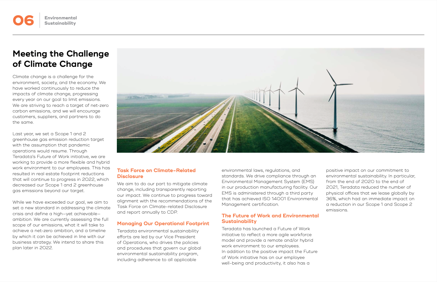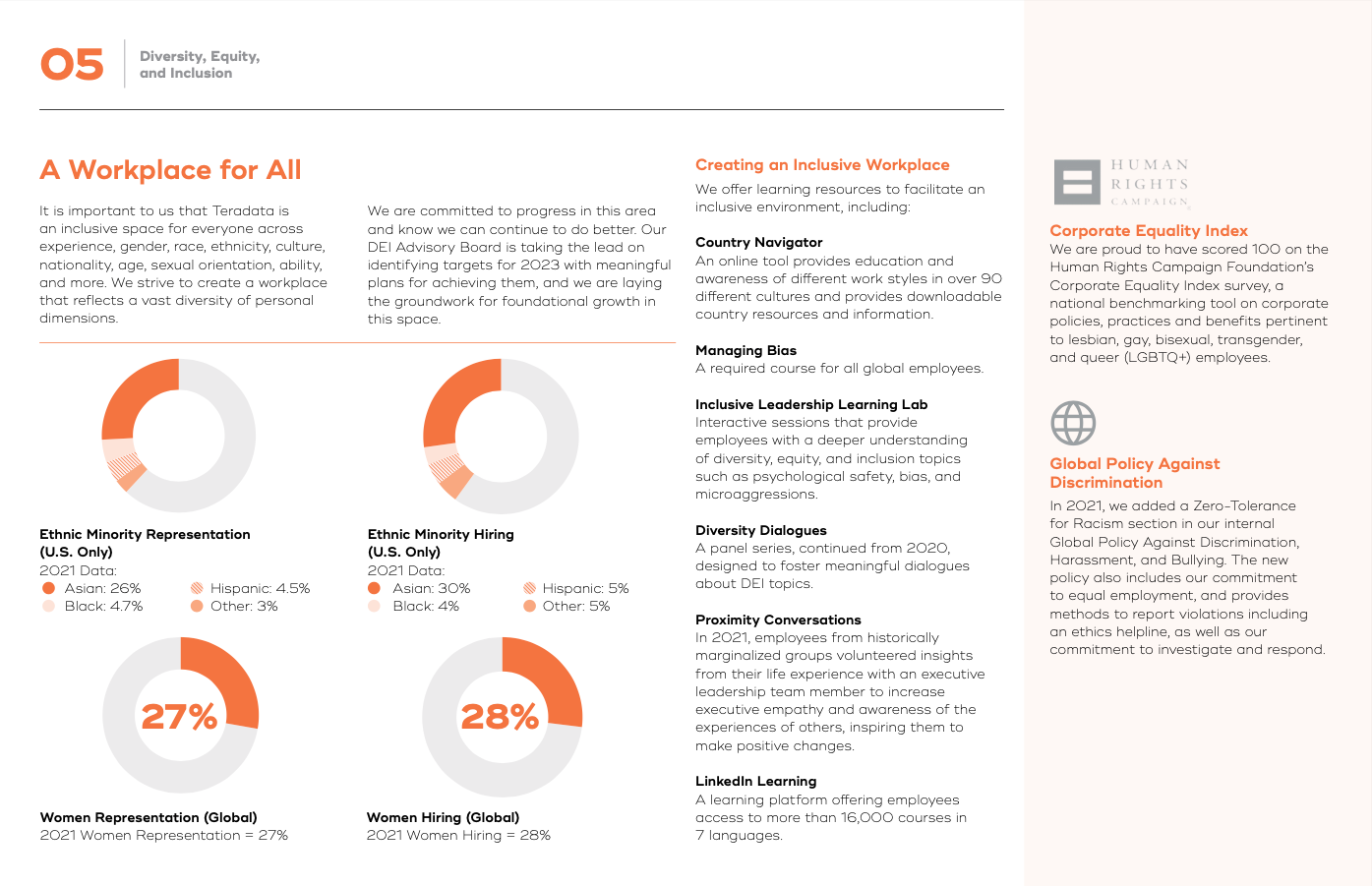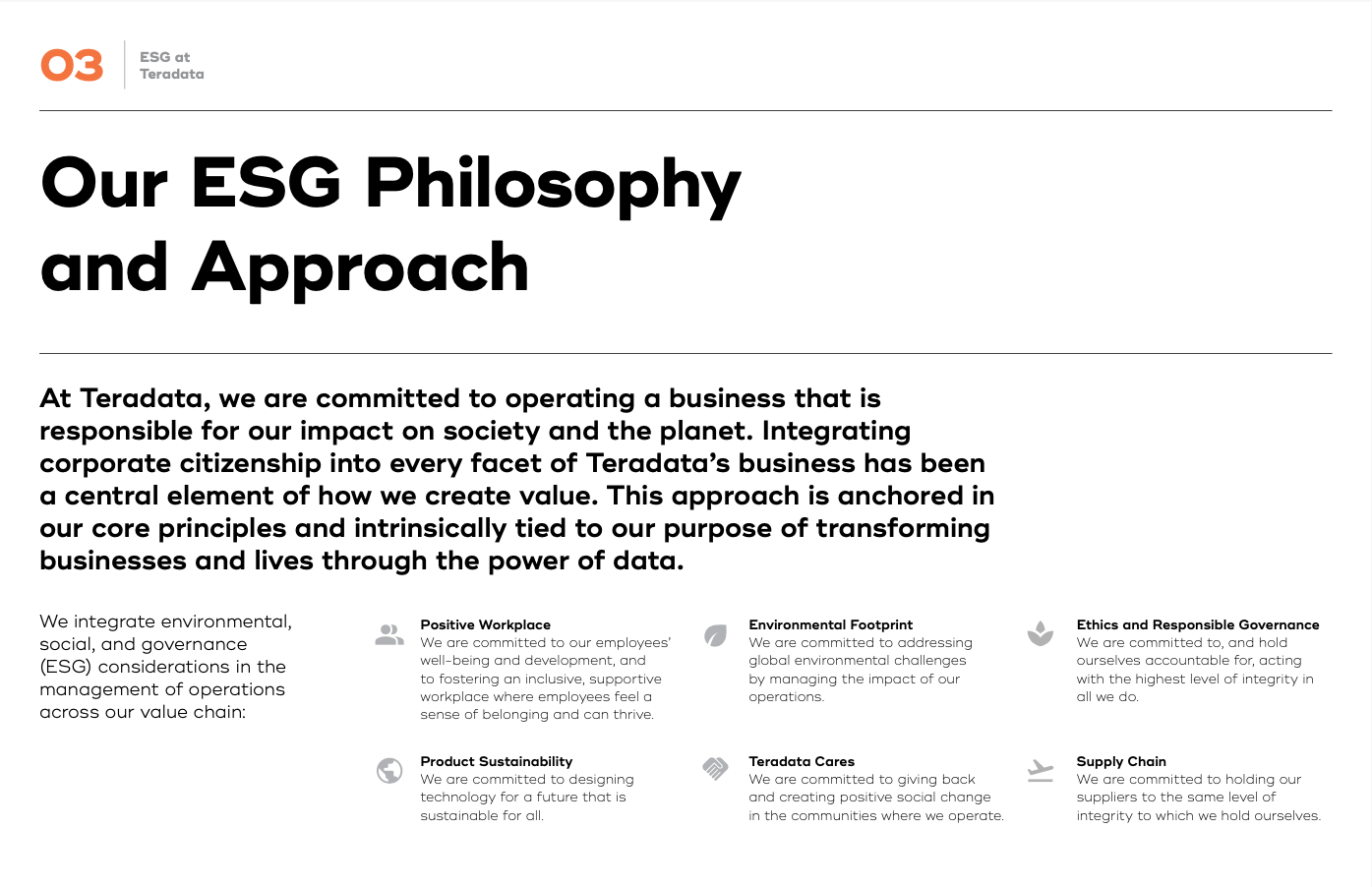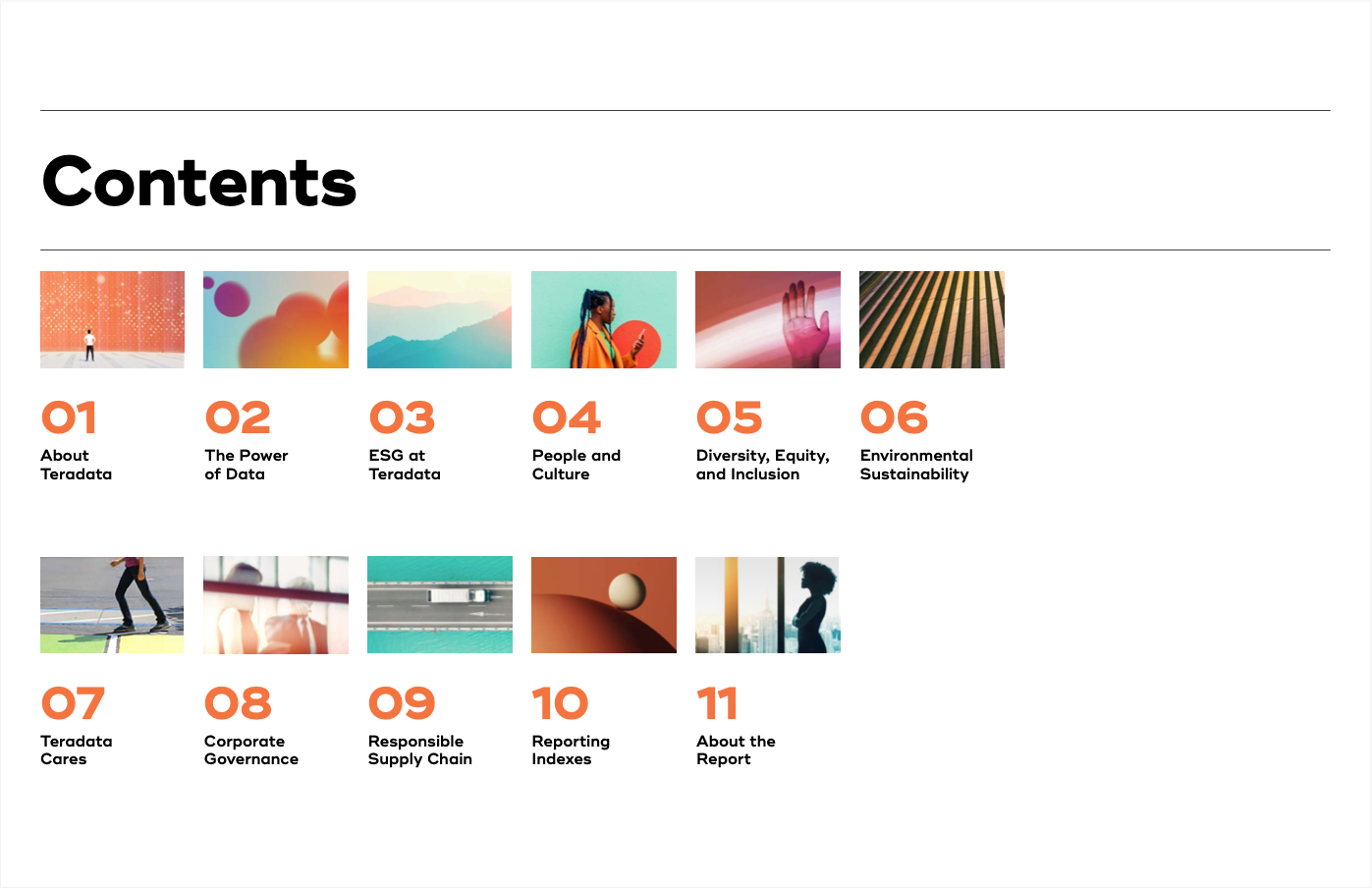 Helped create Teradata's annual report on how they integrate environment, social, and governance (ESG) factors in management of operations across their entire value chain. Created in InDesign, 84p.
